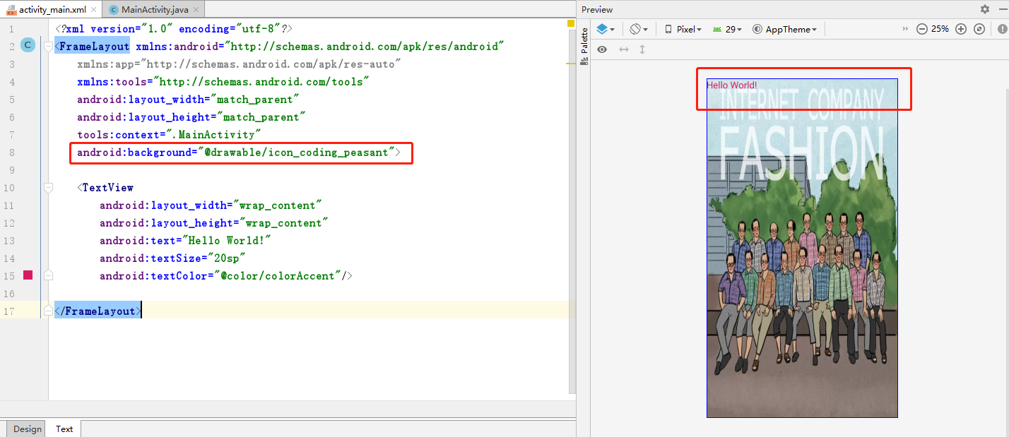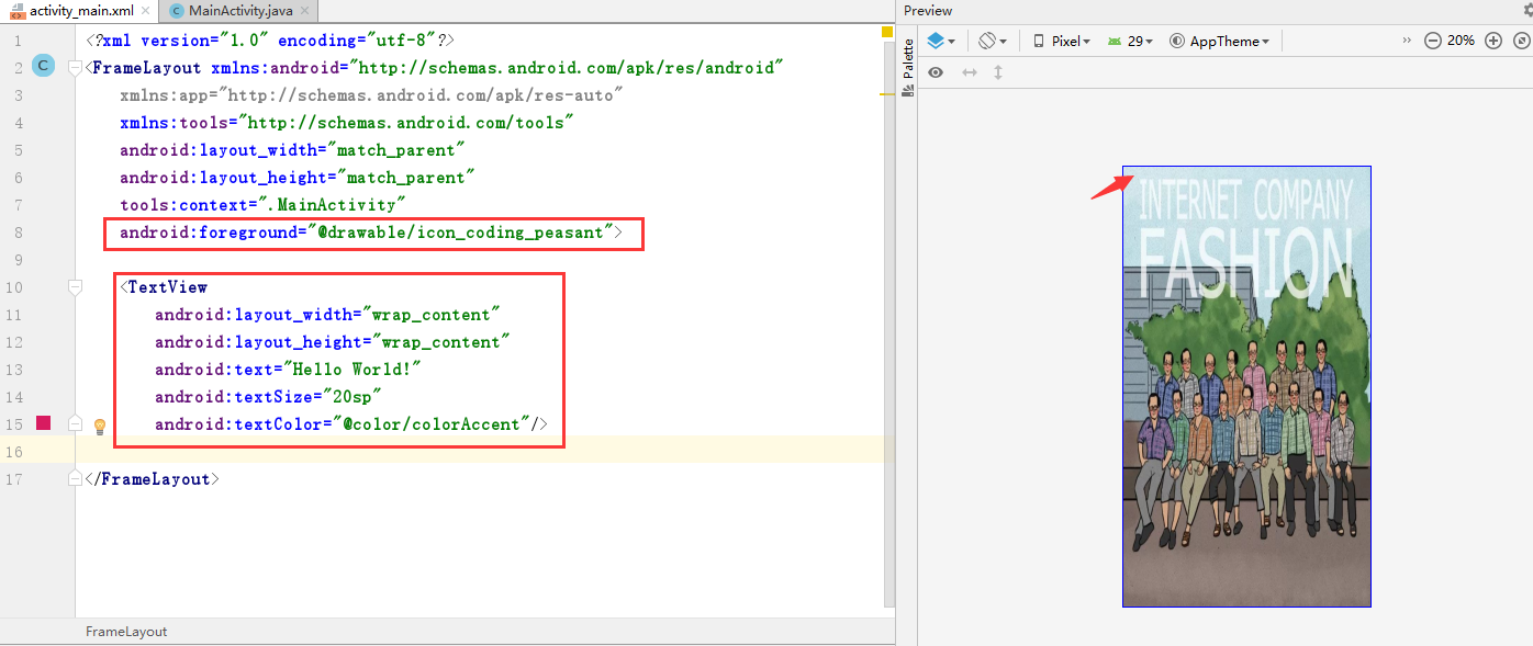 相信小伙伴们看完上图已经彻底明白了什么是前景图像,同样的代码,只是将background变成foreground,可以明确的看出图1中HelloWord依然可以看到,但是在图2中,已经被挡住。我们可以这样简单的去理解,foreground其实就是一本书的封面,它把书中的内容全部遮盖住了。