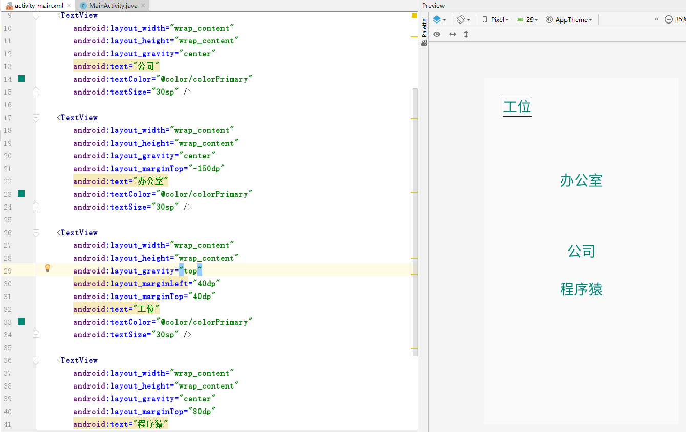 (2) 第二层办公室 :android: layout_gravity = “center” android:layout_marginTop="-150dp" (注意:此处是负数,因为 android:layout_gravity = “center” 表示水平和垂直方向上居中,基准线为视图水平和垂直方向的中点,因为办公室在基准线的上方向(负方向),所以为负数)