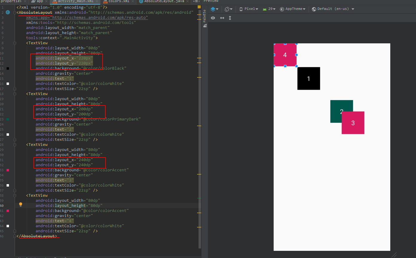 2.在绝对定位中,如果子元素不设置layout_x和layout_y,那么它们的默认值是0。