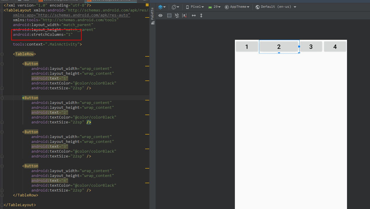 stretchColumns设置运行被拉伸的列的序号 ,如android:stretchColumns="1,3"表示在第三列的和第四列的一起填补空白,如果要所有列一起填补空白,则用“*”符号,列号都是从0开始算的。