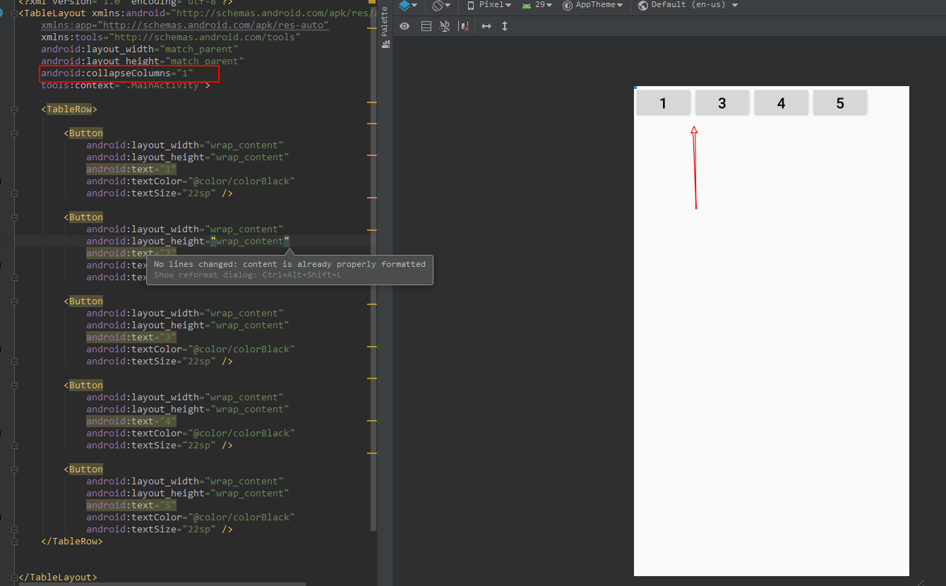 图中在上面的布局中添加 android:collapseColumns="1" ,原来的按钮2被隐藏了。
