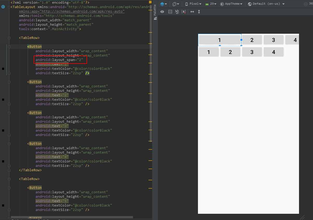 layout_span为该子类控件占据第几列。android:layout_span="3"表示合并3个单元格,就是这个组件将占据3个单元格。