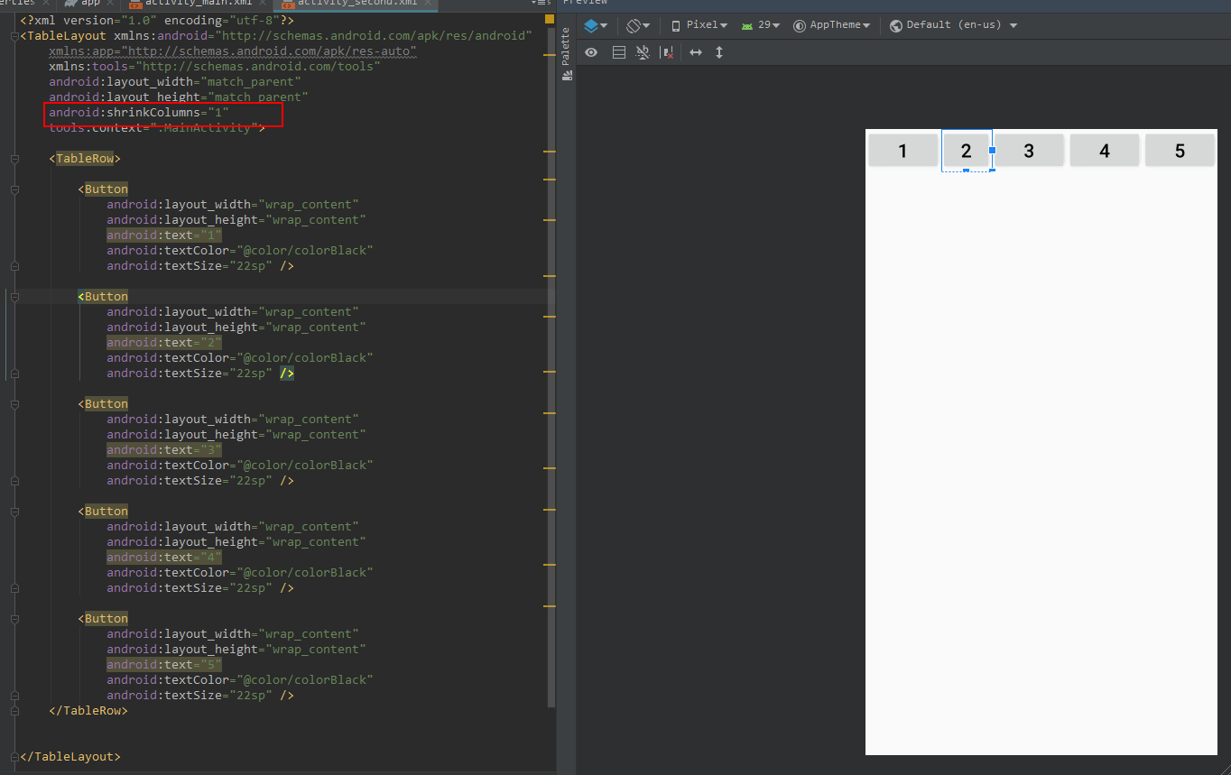 图中又在上面布局添加按钮5,此时 android:shrinkColumns="1",按钮2被收缩了。