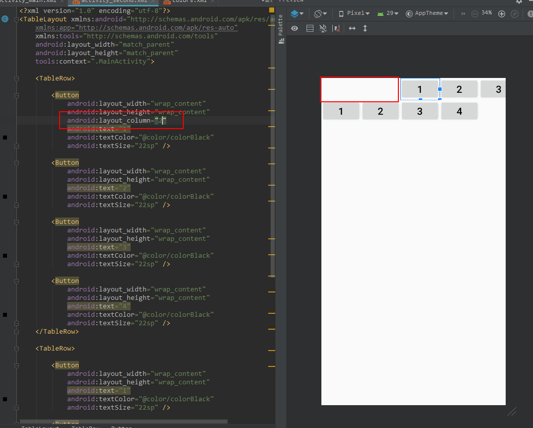 layout_column为该子类控件显示在第几列。android:layout_column="2"表示跳过第二个,直接显示在第三个单元格内。