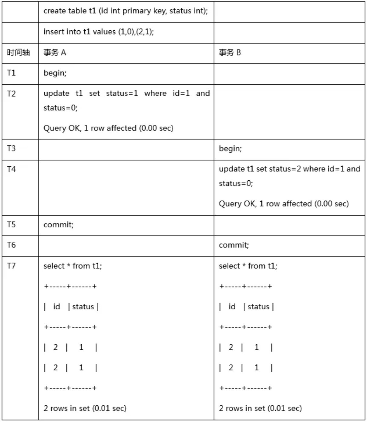 所谓丢失更新是指:两个事务 A、B 读取相同记录并更新同一列的值,若 A 先于 B 提交事务,当 B 事务提交后 A 再次查询时发现自己的更新丢失了。