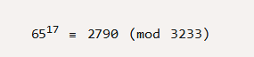 解释一下,c代表加密后数字,(n,e)对应我们的公钥对,m代表明文,≡的意思是同模运算,比如60≡4(mod 7),60对4取模后等于4。好了我们开始计算密文: