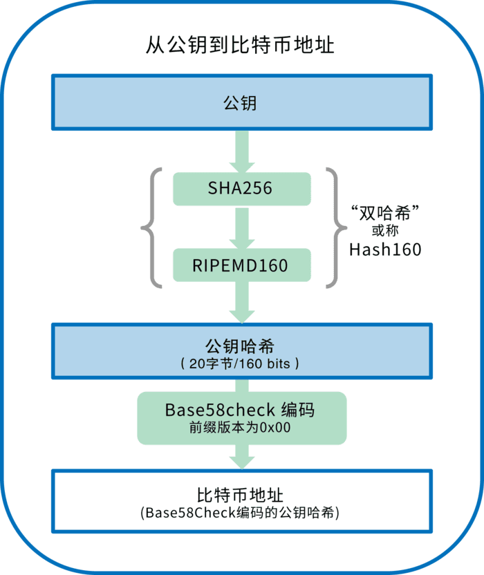 以公钥 K 为输入,计算其SHA256哈希值,并以此结果计算RIPEMD160 哈希值,得到一个长度为160比特(20字节)的数字后进行Base58Check编码即可得到比特币地址。从编码数据结构的视角看,是下图: