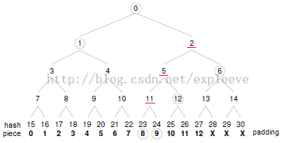 例如,下图就是一个Merkle Hash Tree形状,如果它是Merkle Hash Tree,则节点7的hash value必须是通过节点15、16上的value计算而得到.