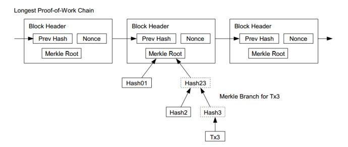 Nonce、难度目标和时间戳会用于挖矿过程,Merkle根用来索引和组织该区块所有的交易信息,其结构见下一节。