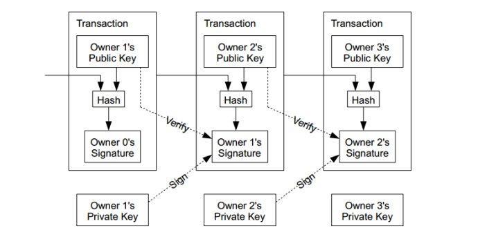 2. 为了方便 Owner1 验证这笔汇款的确来自 Owner0,而不是别人,Owner0 发出的汇款单里,除了有加了密的汇款详情,还有 Owner0 的数字签名(Signature)。Owner1 拿到汇款时,为了验证这笔汇款的确来自 Owner0,他可以用 Owner0 的公钥,来验证汇款单中 Owner0 的数字签名。
