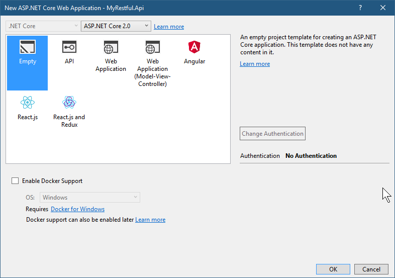 打开VS2017, 选择ASP.NET Core Web Application项目模板, 写好名字, OK.