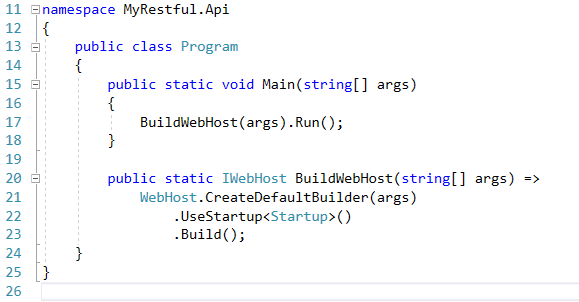 Main方法是程序的入口. 而Web的宿主是通过BuildWebHost函数来实例化的, 它调用了WebHost.CreateDefaultBuilder方法, 很明显这是一个建造者模式, 它最终会构建出一个web宿主.