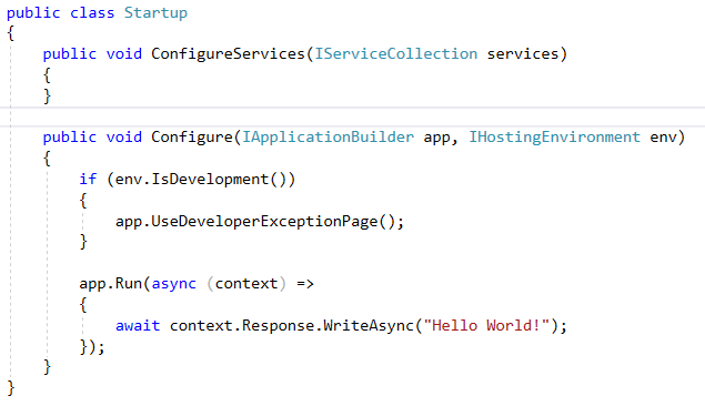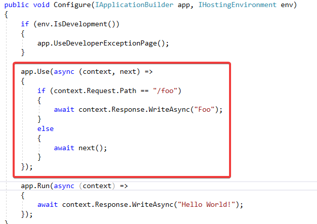 IApplicationBuilder的扩展方法Run会传递一个RequestDelegate, 其内部功能就是回写Hello World.