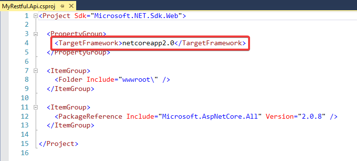 这里, SDK属性表示了我们使用的是哪个SDK, 而目标框架是.NET Core 2.0.