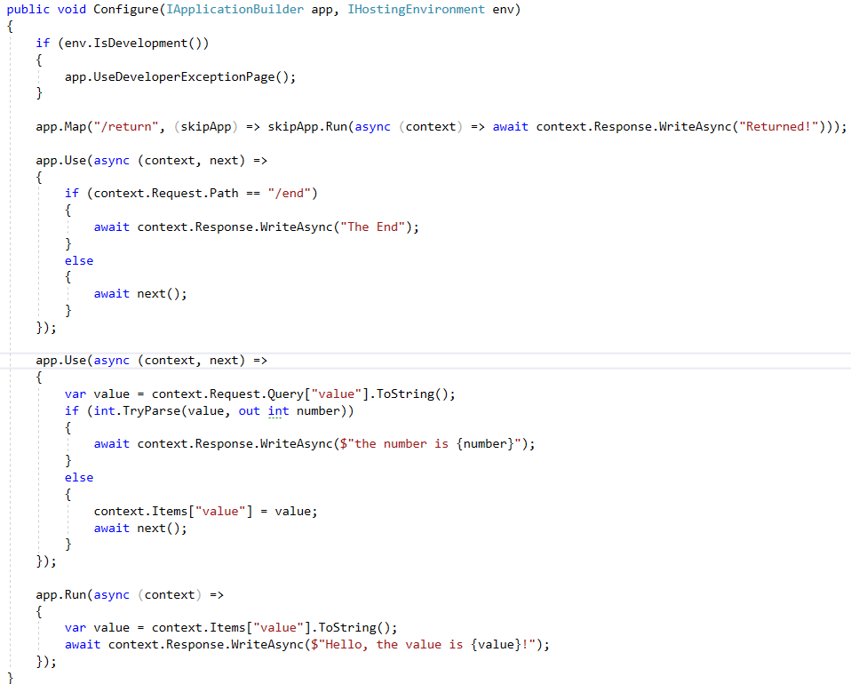中间件最好不要像上面一样写在Startup类里, 每个中间件应该放在单独的类里.