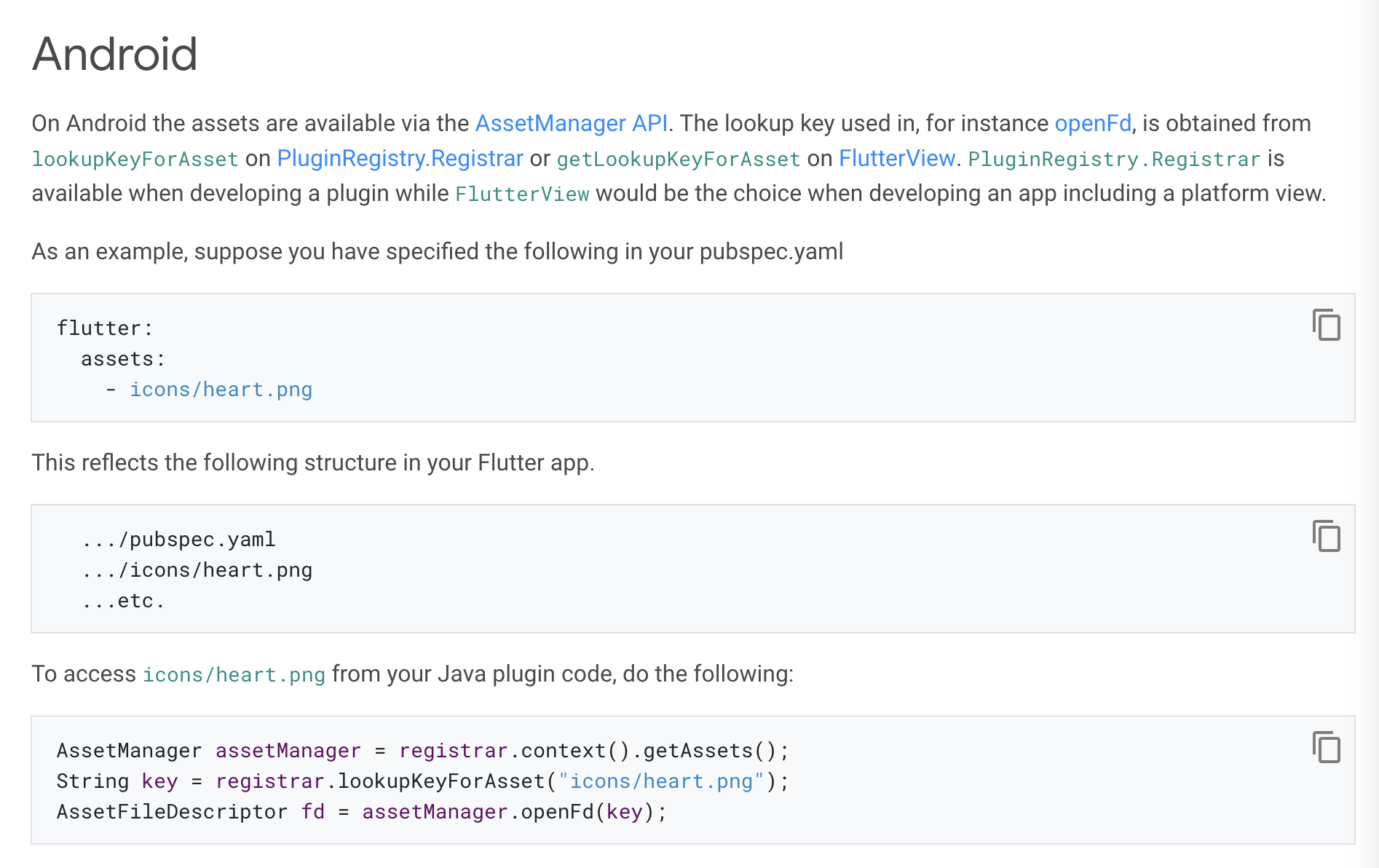另一种常用的方式是以插件方式,Flutter 在使用 AndroidView 方式嵌入 Native View 与 Android 进行交互时;核心方法同样是 lookupKeyForAsset 获取资源路径,之后便是用原生方法解析 assets 资源文件;