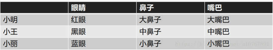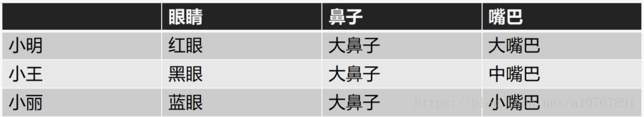 那如果他们鼻子这一维度的数据各不相同,如下图中,三个人分别是大、中、小鼻子(方差很大)。那么我们从鼻子这一维度获得的信息量就很大了,甚至直接用这一个维度就可以识别出是谁的人脸图像。