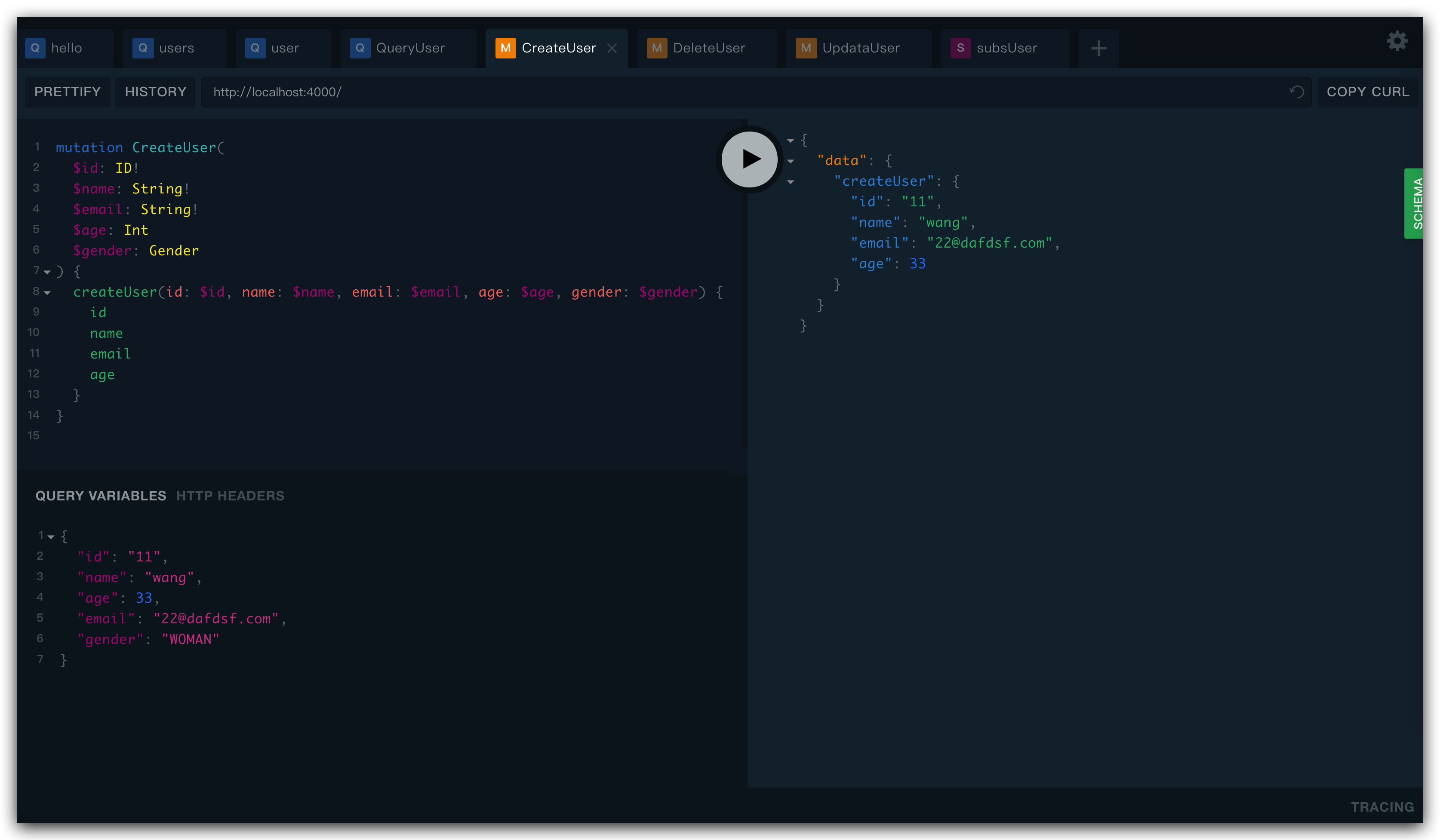 createUser(id: ID!, name: String!, email: String!, age: Int,gender: Gender): User!