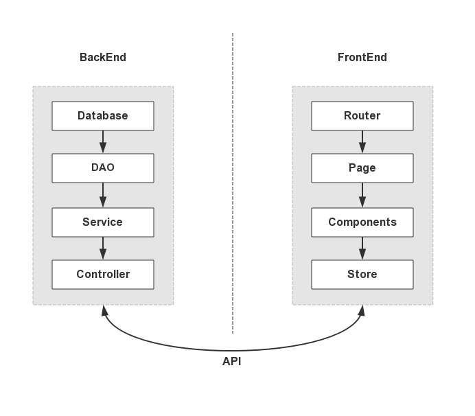 目前前后端的结构大概如下图。后端通过 DAO 层与数据库连接实现数据持久化,服务于处理业务逻辑的 Service 层,Controller 层接受 API 请求调用 Service 层处理并返回;前端通过浏览器 URL 进行路由命中获取目标视图状态,而页面视图是由组件嵌套组成,每个组件维护着各自的组件级状态,一些稍微复杂的应用还会使用集中式状态管理的工具,比如 Vuex、Redux、Mobx 等。前后端只通过 API 来交流,这也是现在前后端分离开发的基础。