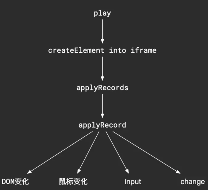 为了降低网络开销,我们换个思路,我们在最开始的页面基础上,记录下一步步操作,在我们需要"播放"的时候,按照顺序应用这些操作,这样我们就能看到页面的变化了。这个思路把鼠标操作和DOM变化分开: