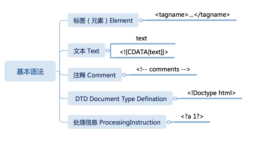 HTML 语法源自 SGML,包含了五种节点:标签(元素)、文本、注释、文档类型定义(DTD)和处理信息(ProcessingInstruction)。
