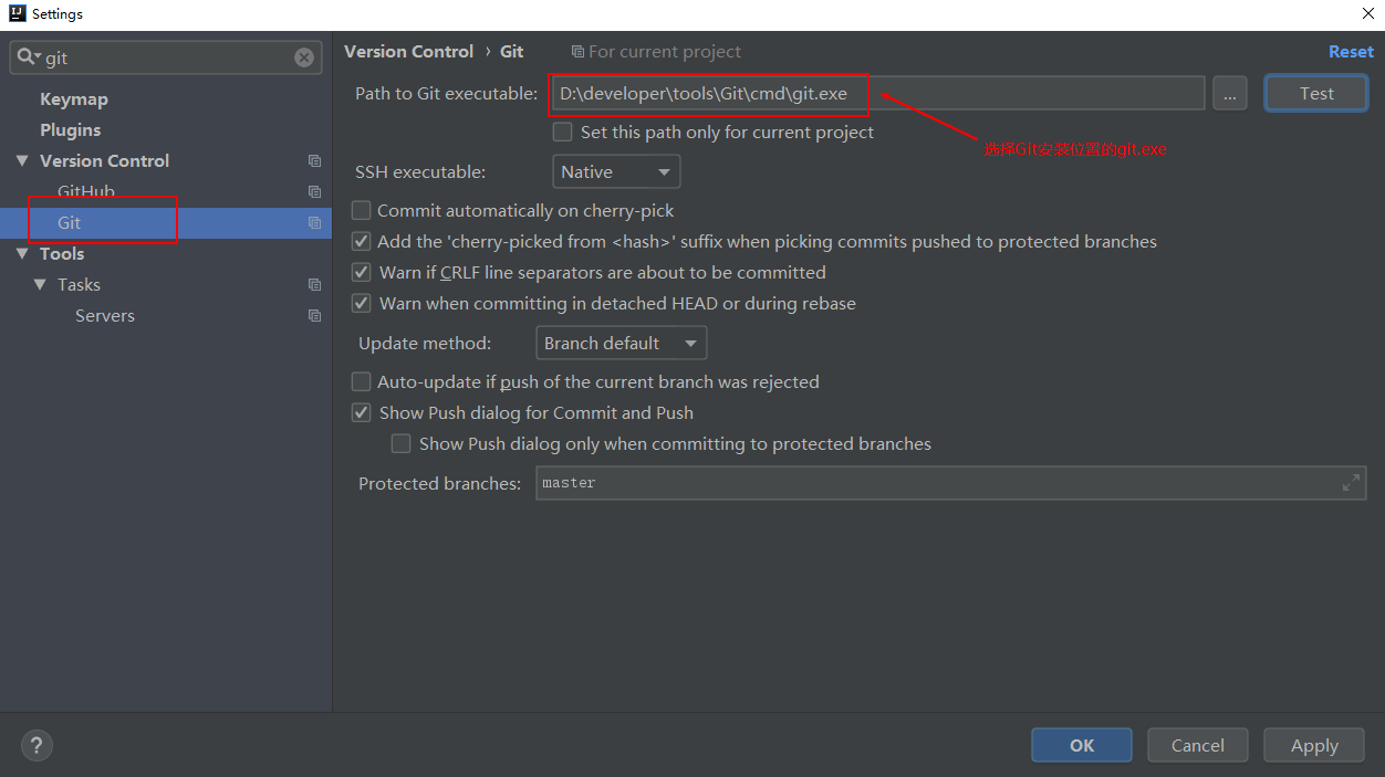 - 由于IDEA中的Git插件需要依赖本地Git客户端,所以需要进行如下配置:
