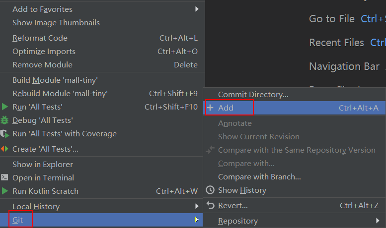 - 右键项目打开菜单,将所有文件添加到暂存区中: