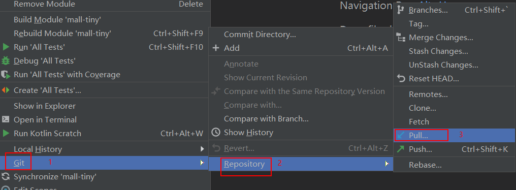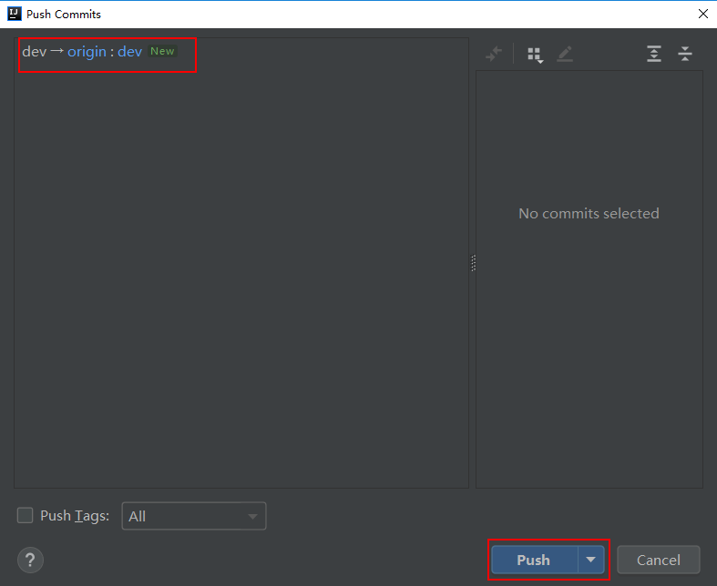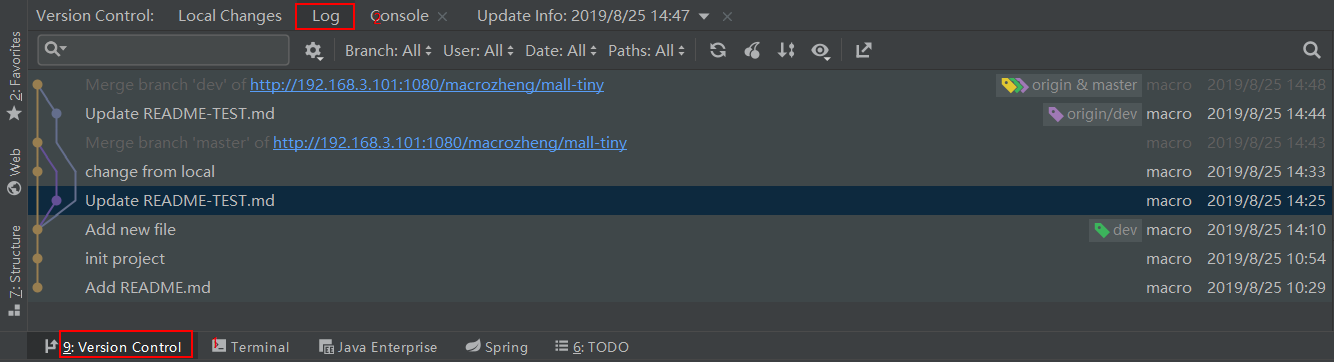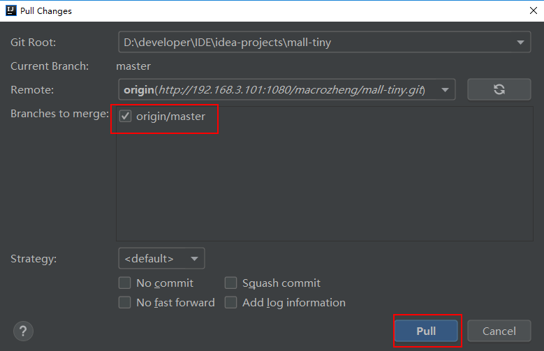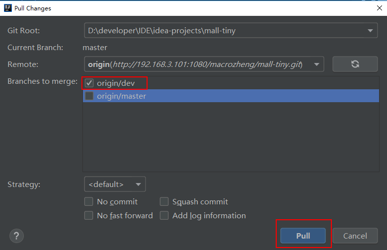 - 在本地仓库拉取代码,选择从dev分支拉取并进行合并: