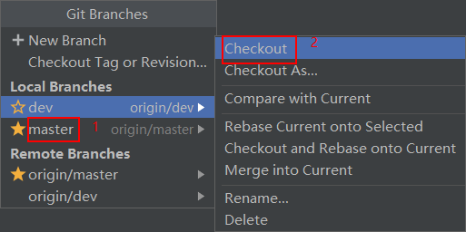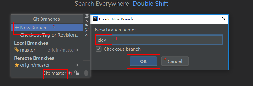 - 在本地创建dev分支,点击右下角的Git:master按钮: