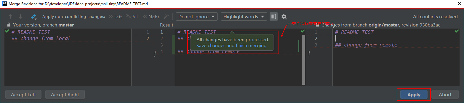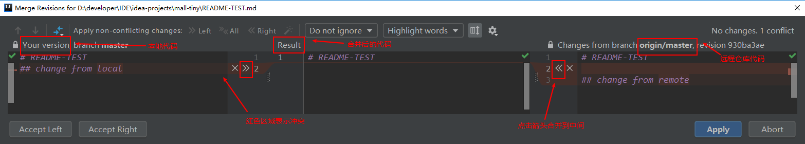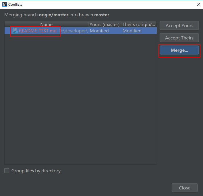 - 提交本地仓库代码并拉取,发现代码产生冲突,点击Merge进行合并: