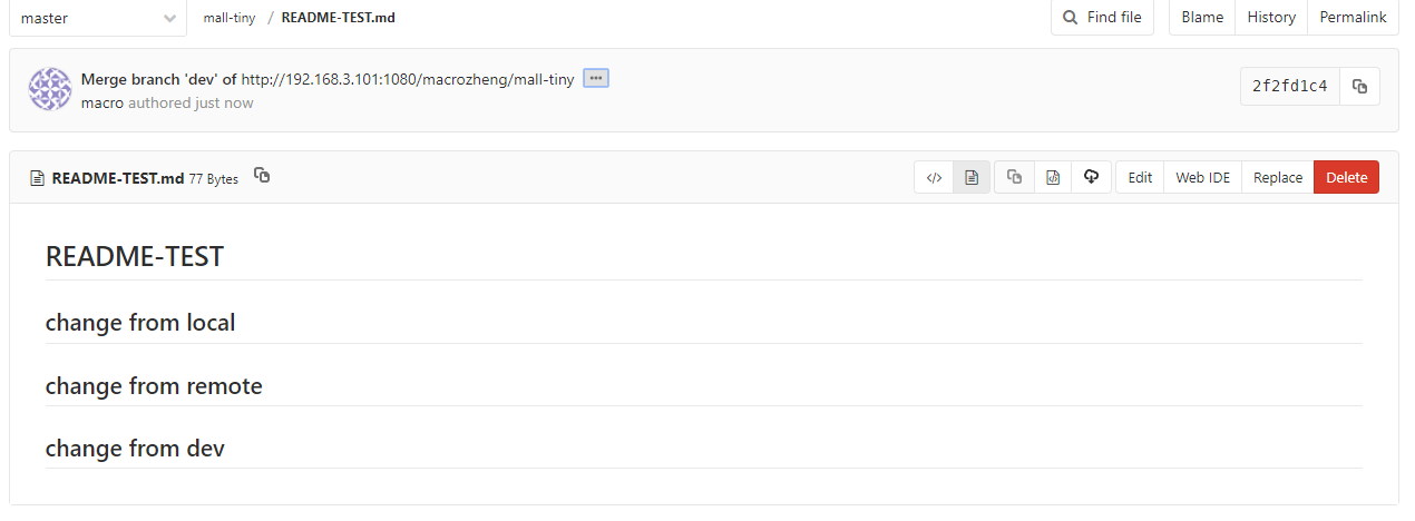 - 发现产生冲突,解决后提交并推送到远程仓库即可。