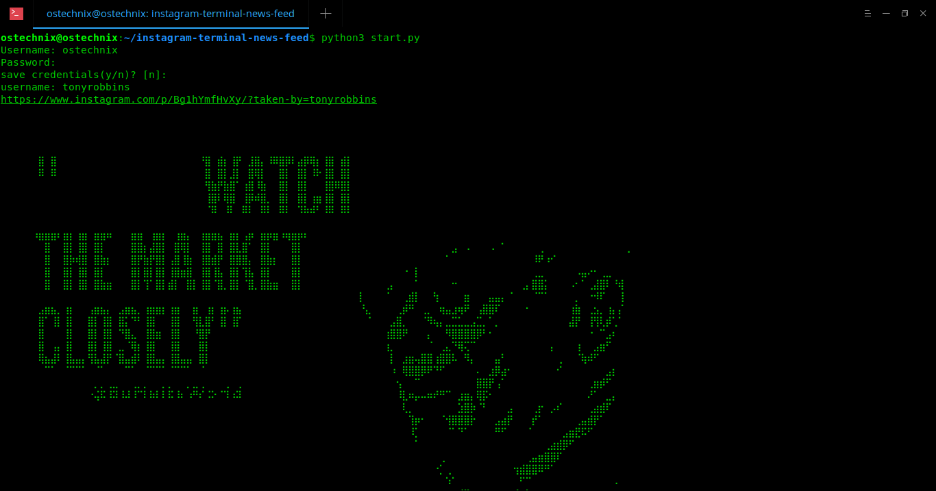 输入你的 Instagram 用户名和密码,并直接从终端中浏览你的 Instagram feed。你的 instragram 用户名和密码将仅本地存储在名为 credential.json 的文件中。所以,你不必担心它。你也可以选择不保存默认保存的凭证。