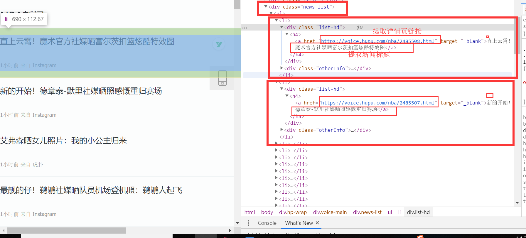 好了,接下来我们一起分析页面吧,想必你还没浏览过吧,点击这里浏览虎扑新闻。在列表页中,我们利用 F12 审查元素查看页面结构,经过我们分析发现列表新闻在 <div class="news-list">标签下,每一条新闻都是一个li标签,分析结果如下图所示: