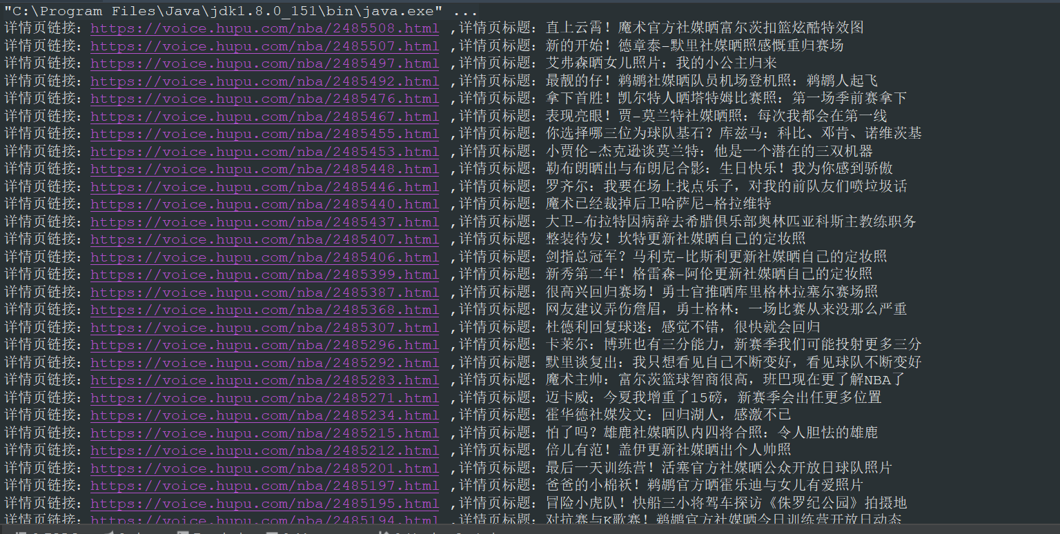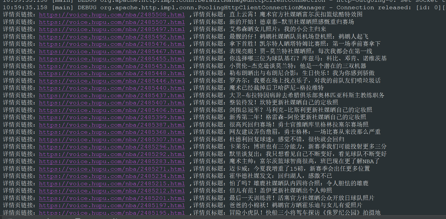 使用 httpclient + 正则表达式的方式同样正确的获取到了列表新闻的标题和详情页链接。到此 Java 爬虫系列博文第一篇就写完了,这一篇主要是 Java 网络爬虫的入门,我们使用了 jsoup 和 httpclient + 正则的方式提取了虎扑列表新闻的新闻标题和详情页链接。当然这里还有很多没有完成,比如采集详情页信息存入数据库等。