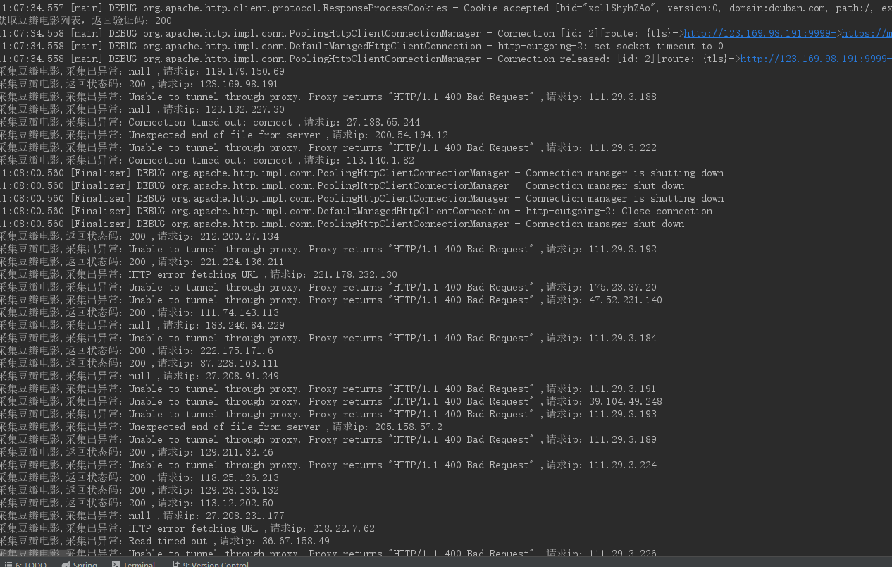 System.out.println("采集豆瓣电影,采集出异常:" + e.getMessage() + " ,请求ip:" + proxys[0]);