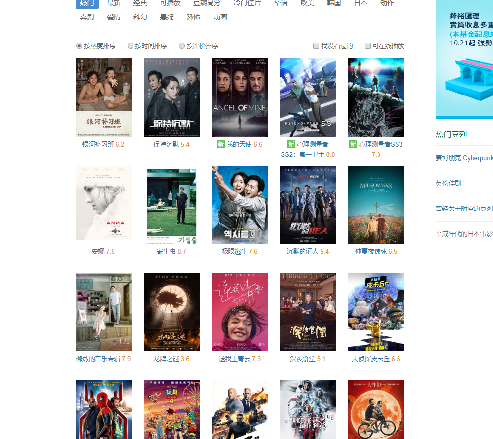 这段程序的逻辑比较简单,先采集到豆瓣热门电影,这里使用直接访问 Ajax 获取豆瓣热门电影的链接,然后解析出电影的详情页链接,多线程访问详情页链接,因为只有在多线程的情况下才能达到豆瓣的访问要求。豆瓣热门电影页面如下: