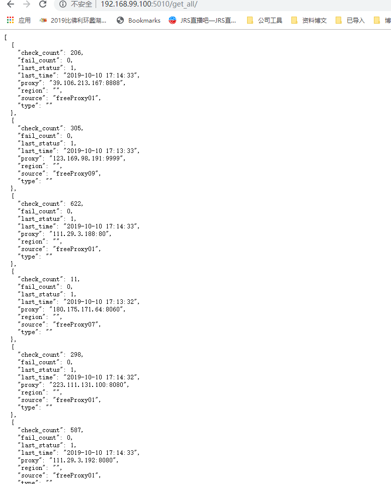 运行镜像后,我们等待一段时间,因为第一次启动采集数据和处理数据需要一段时间。等待之后访问 http://{your_host}:5010/get_all/,如果你得到下图所示的结果,说明 proxy_pool 项目你已经部署成功。