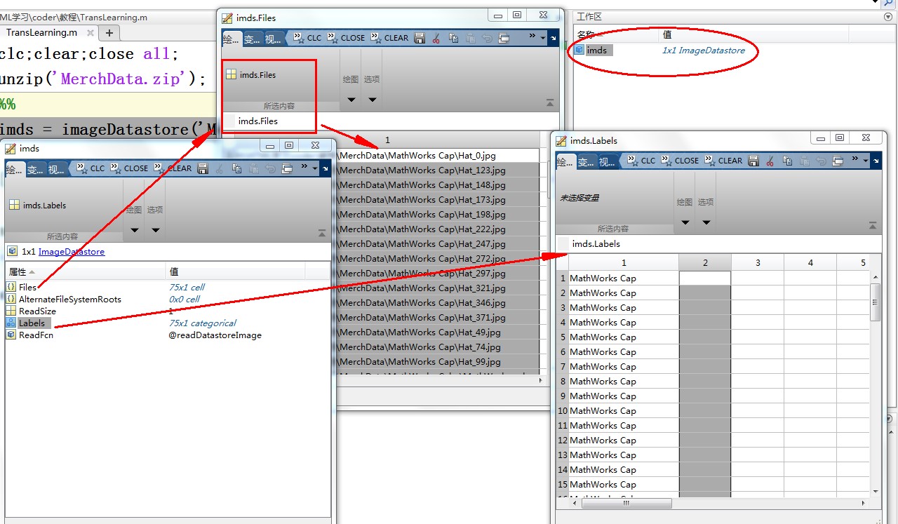 这个文件夹里面就是本次实验所使用的数据。为了更方便地组织该数据,我们使用imageDatastore函数来构造一个数据结构,用以管理数据。执行上面一句之后得到来一个imageDatastore数据结构,我们进入当前的工作空间对其进行观察。