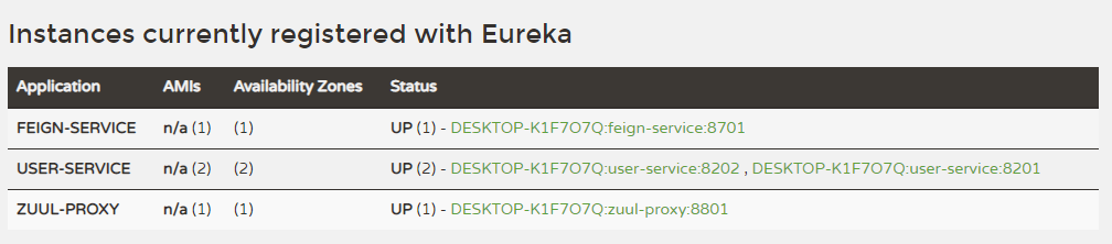 这里我们通过启动eureka-server,两个user-service,feign-service和zuul-proxy来演示Zuul的常用功能,启动后注册中心显示如下。