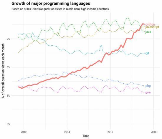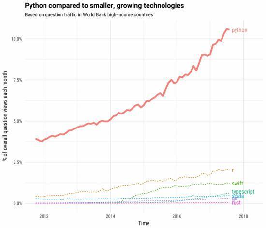 在这篇文章中,我们将探讨在过去五年中Python编程语言的非凡增长,如高收入国家的Stack Overflow流量所示。“增长最快”这个术语可能难以定义,但是我们认为Python可以成为增长最快的主要编程语言。