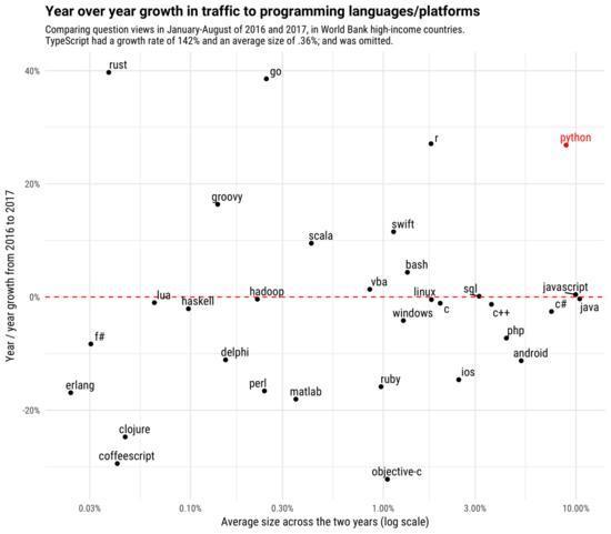 请注意,我们并不是说这些语言与“Python”竞争。相反,我们正在解释为什么我们会在另一个类别中对待他们的成长; 这些都是较低流量的标签。Python是一个不寻常的例子,既是Stack Overflow中最受欢迎的标签之一,也是增长最快的之一。(顺便说一句,它也在加速!自2013年以来,每年的增长速度都会更快)。