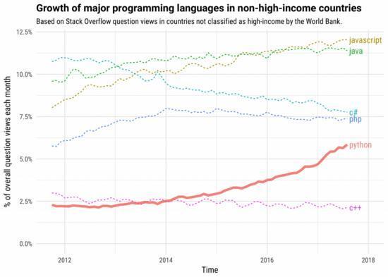 2017年6月是Python是高收入国家Stack Overflow访问量最大的第一个月。这包括在美国和英国以外访问量最大的标签,以及几乎所有其他高收入国家(除Java或JavaScript之外)的前两名。这是特别令人印象深刻的,因为在2012年,其访问次数少于其他5种语言,当时增长了2.5倍。