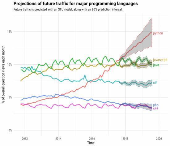 部分原因是因为Java的流量的季节性。由于本科课程的教学很重要,夏季,Java流量在秋季和秋季都会上升。到年底,它会再次赶上Python吗?我们可以尝试使用“STL”模型预测未来两年的增长,该模型将增长与季节趋势相结合,以预测未来价值。