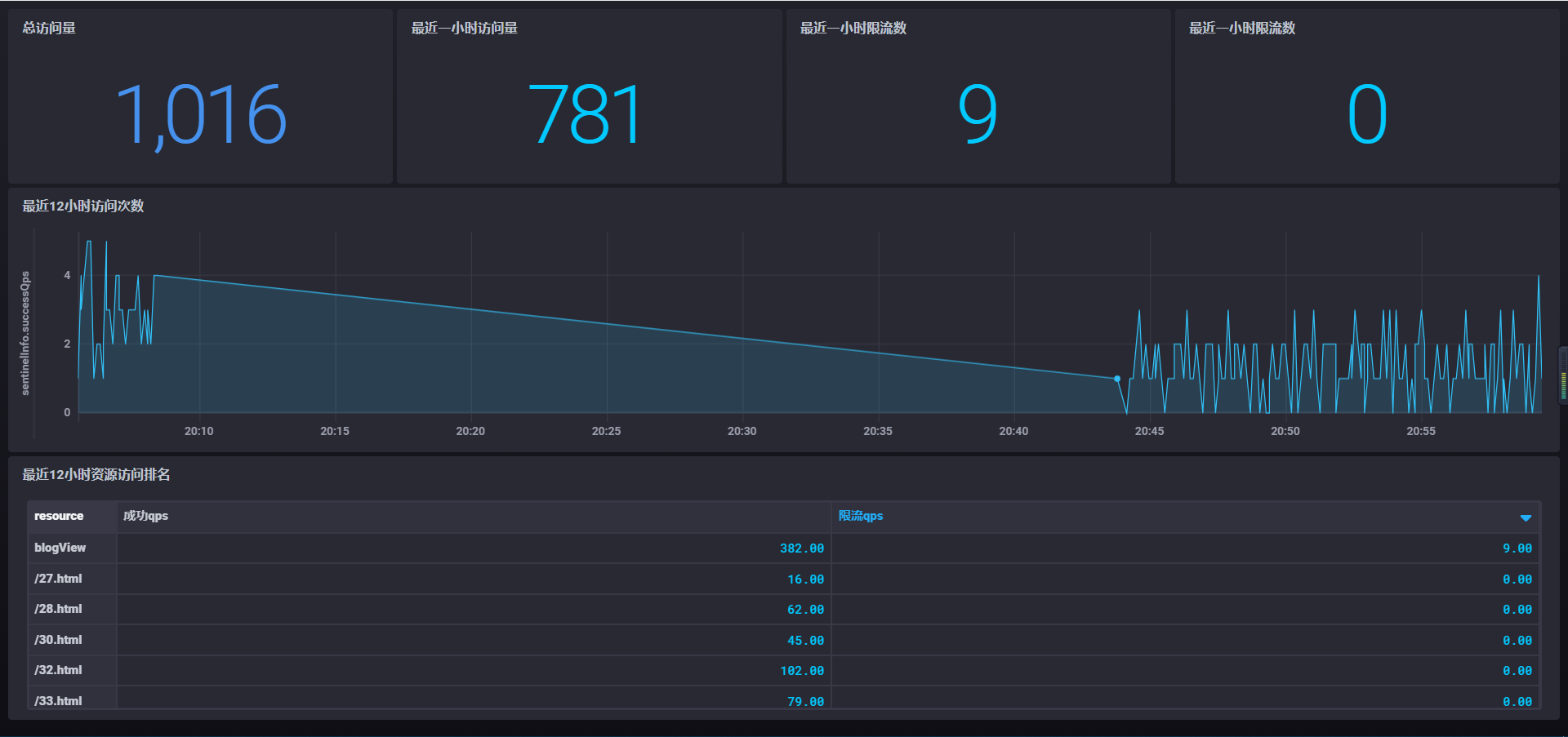 这里根据 Sentinel 限流组件采集的数据,组装了一个简单的监控大屏,可以监控历史访问总量、最近一小时的访问量、限流数以及最近几分钟或者几小时的访问曲线等等,相比于阿里演示版是不是瞬间高大上的些许。