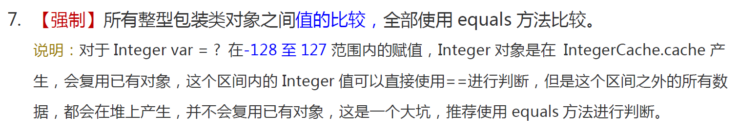 在阅读《阿里巴巴Java开发手册》时,发现有一条关于整型包装类对象之间值比较的规约,具体内容如下: