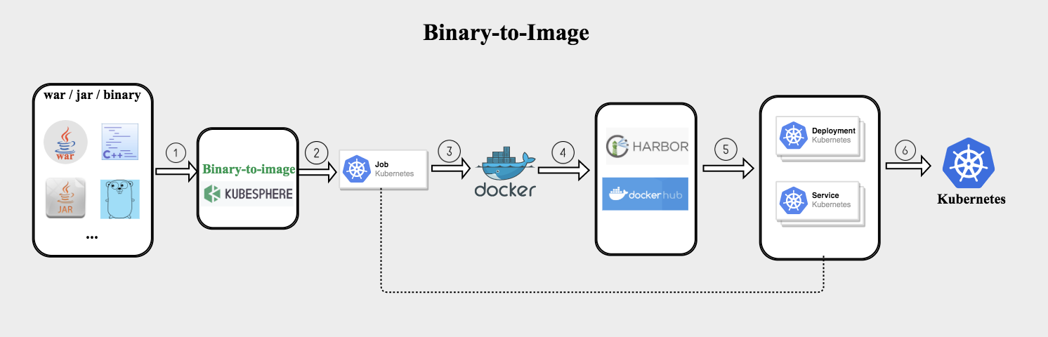 Binary-to-image(B2I) 是 KubeSphere 容器平台在 2.1.0 版本新增的功能,旨在帮助开发者和运维在项目打包成 WAR、JAR、Binary 这一类的制品后,快速将制品或二进制的 Package 打包成 Docker 镜像,并发布到 DockerHub 或 Harbor 等镜像仓库中。并且支持以创建服务的形式,一键将制品生成镜像推送到仓库,并创建其部署(Deployment)和服务(Service)最终 自动发布到 Kubernetes 中。