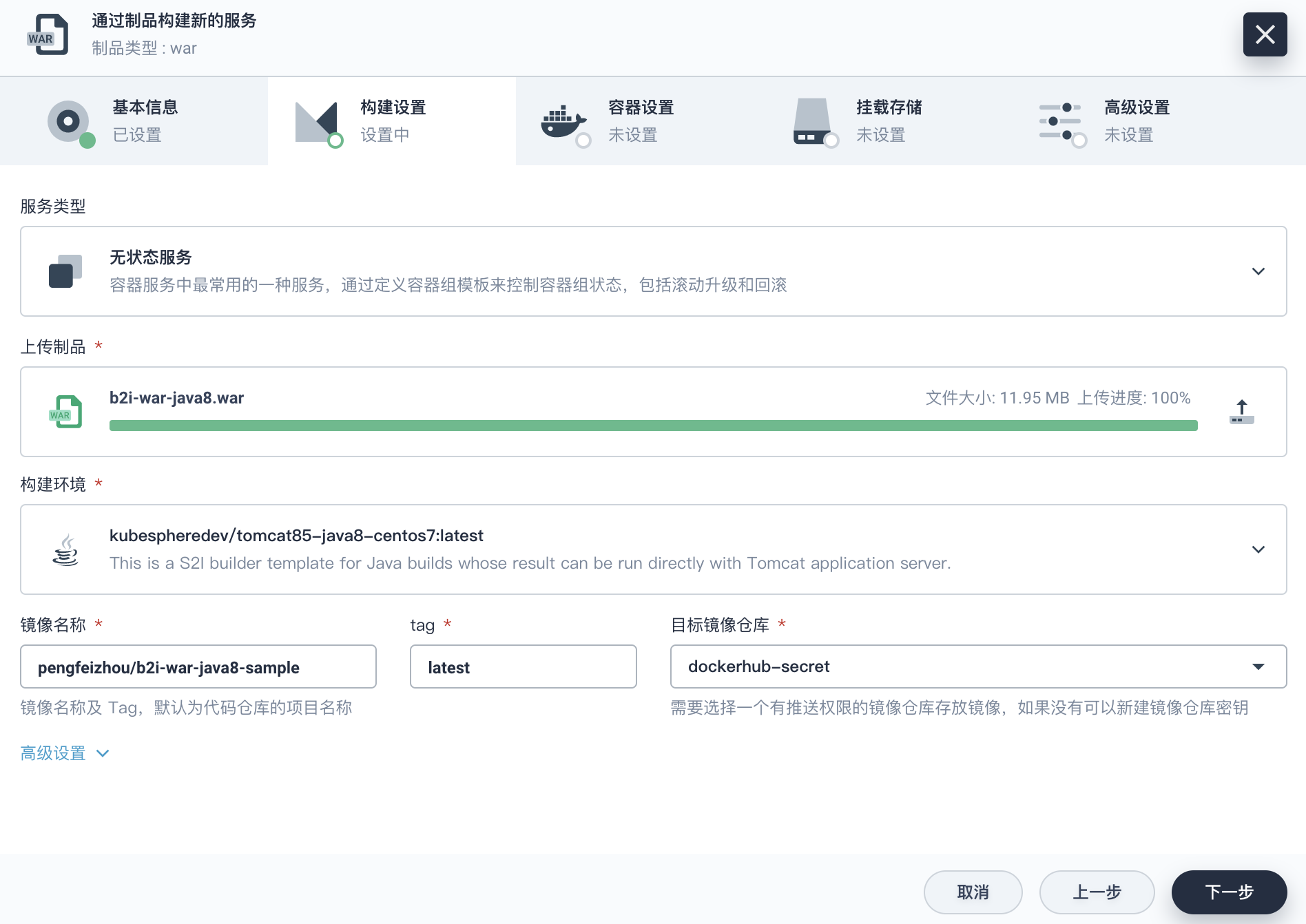 自定义名称,如 b2i-war-java8,下一步构建设置中,默认无状态服务,点击将本地的制品b2i-war-java8.war上传,构建环境选择tomcat85-java8-centos7:latest。