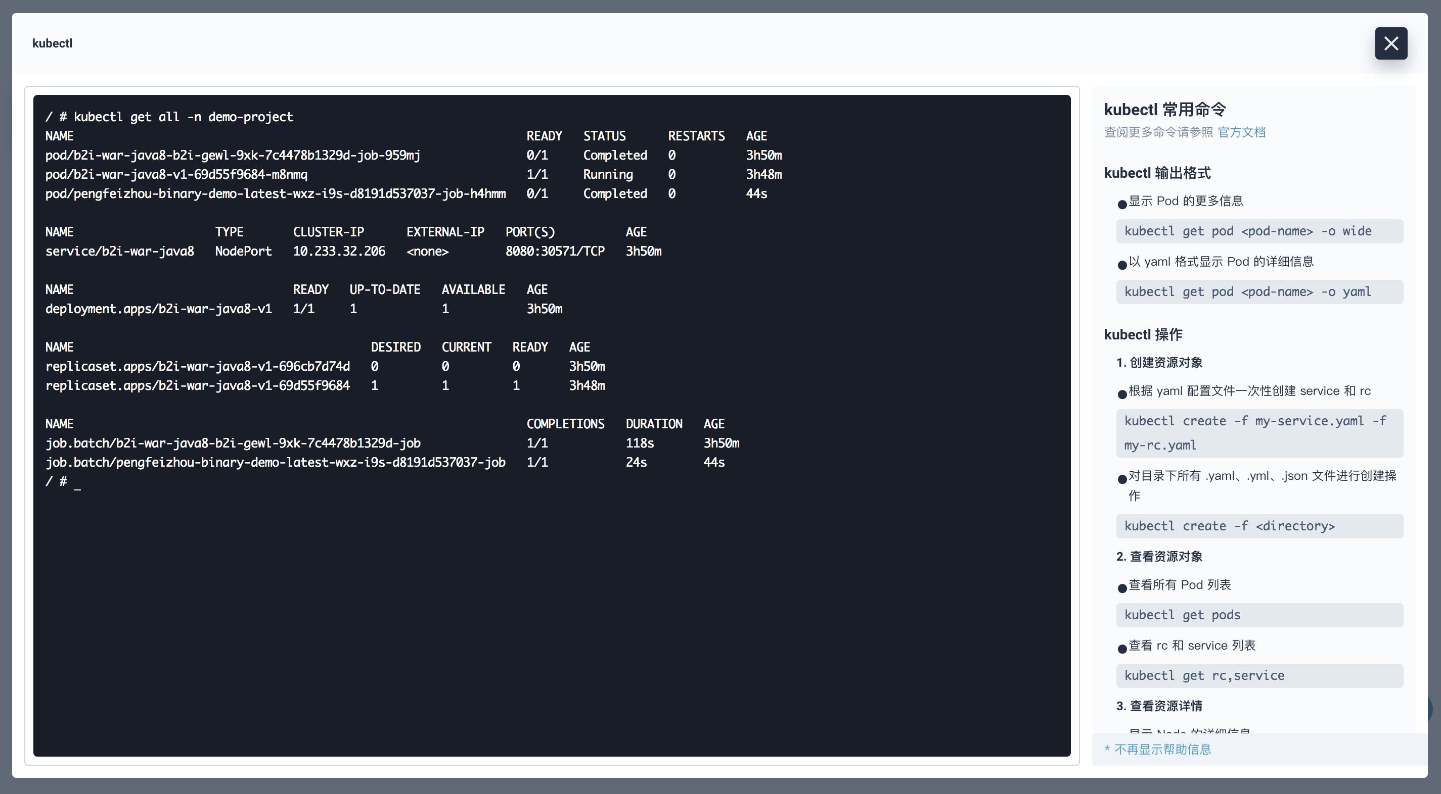 若您习惯使用 kubectl 命令行,也可以通过 工具箱 → Web Kubectl 通过 kubectl get all -n PRJECT_NAME 来查看 b2i 具体创建了哪些资源。