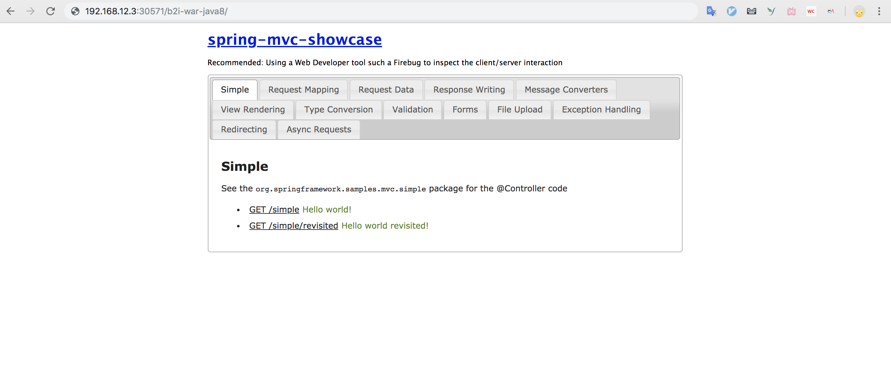 从服务的列表中,可以看到 NodePort 是 30571,因此在浏览器通过 <$IP>:<$NodePort>/spring-mvc-showcase/ 访问 Spring-MVC-Showcase 服务(默认的访问路径 <$IP>:<$NodePort> 是 tomcat 服务)。