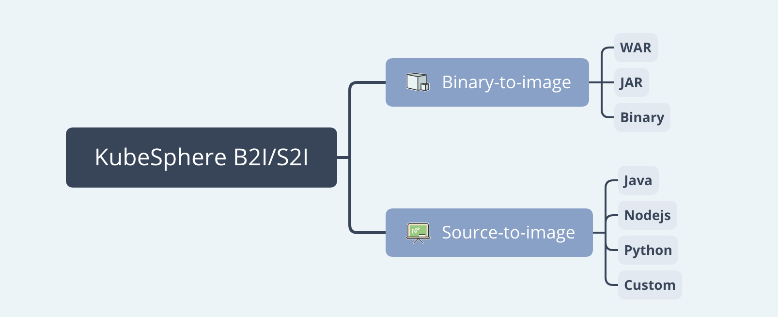 您可以根据需求使用上述两种不同的方式来完成 B2I 的自动镜像构建。一般来说,像 Java 语言的项目,可以通过 mvn package 命令打成 JAR/WAR 包,而像 C、C++ 和 Go 这类不需要运行时的语言,可以使用其语言自身的 build 命令打包成 binary 格式的制品,最终就可以通过 KubeSphere B2I 来快速将制品打包成 Docker 镜像,并发布到镜像仓库和 Kubernetes 中。而像 Python、Nodejs 和 PHP 这类脚本式语言的项目,可以通过 KubeSphere Source-to-Image(S2I) 完成类似 B2I 的自动构建与发布。